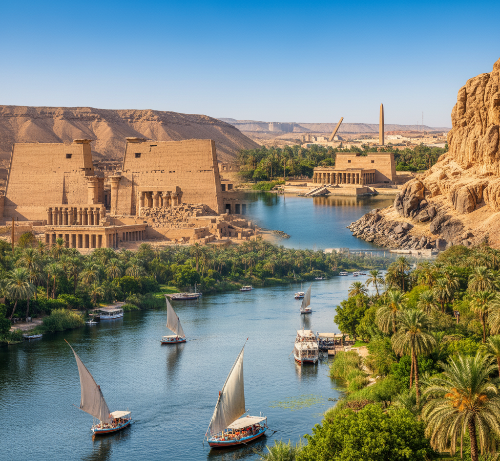 Aswan is a peaceful city in southern Egypt, famous for the Nile, Nubian culture, and ancient temples like Philae.